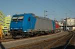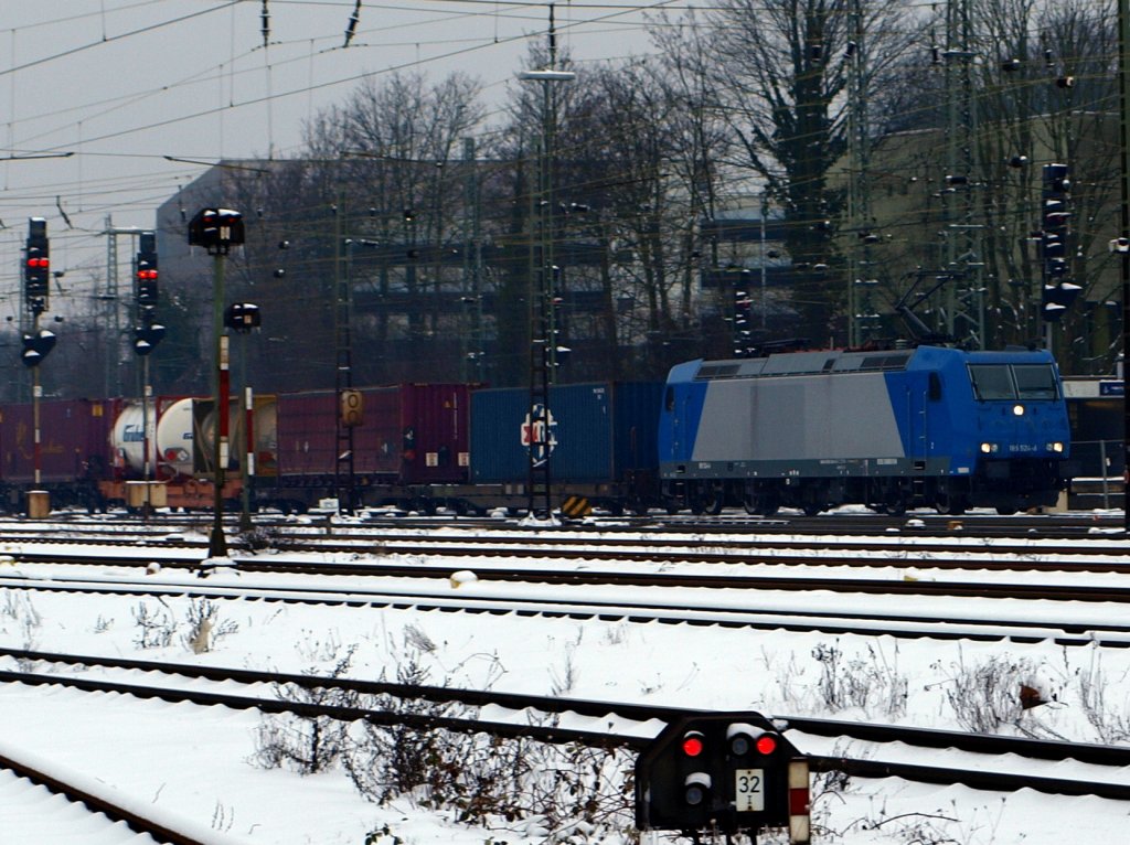 Die blaue 185 524-6 kommt am 11.02.2010 mit einem Containerzug in Aachen West an.