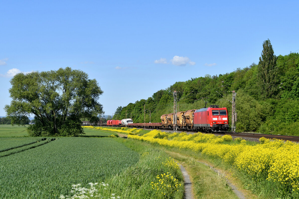 Am 28.12.2025, bei Ahresndorf, fuhr 185 059 mit dem DHL-Zug (Postzug) aus Großbeeren, in Richtung Saarmund, auf dem Berliner Außenring.