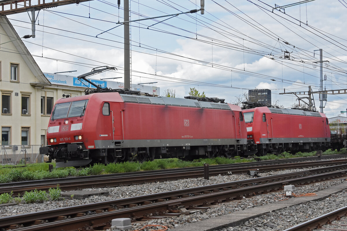 Doppeltraktion, mit den DB Loks 185 113-8 und 185 136-9 durchfährt am 16.04.2026 den Bahnhof Pratteln.