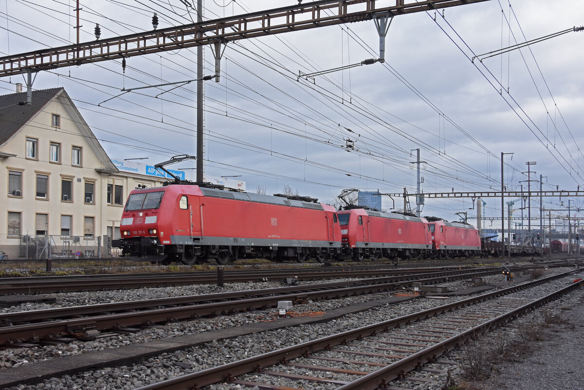 Dreifach Traktion, mit den DB Loks 185 117-9, 185 127-8 und 185 089-0 durchfährt am 10.02.2026 den Bahnhof Pratteln.
