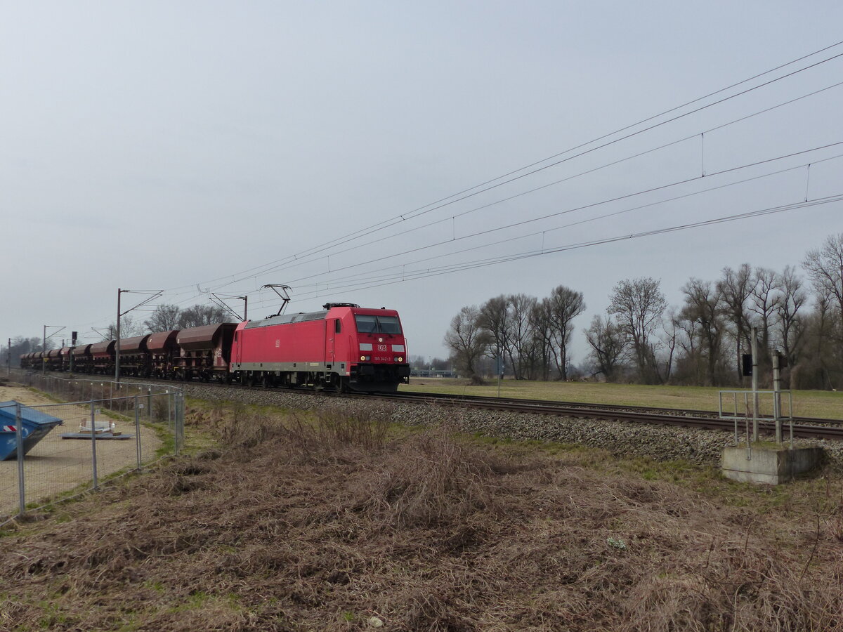 DB Cargo 185 342-3 ( 9180 6185 342-3 D-DB ) mit einem Schüttgutzug südwestlich von Moosburg an der Isar unterwegs Richtung Landshut am 9.3.2026
