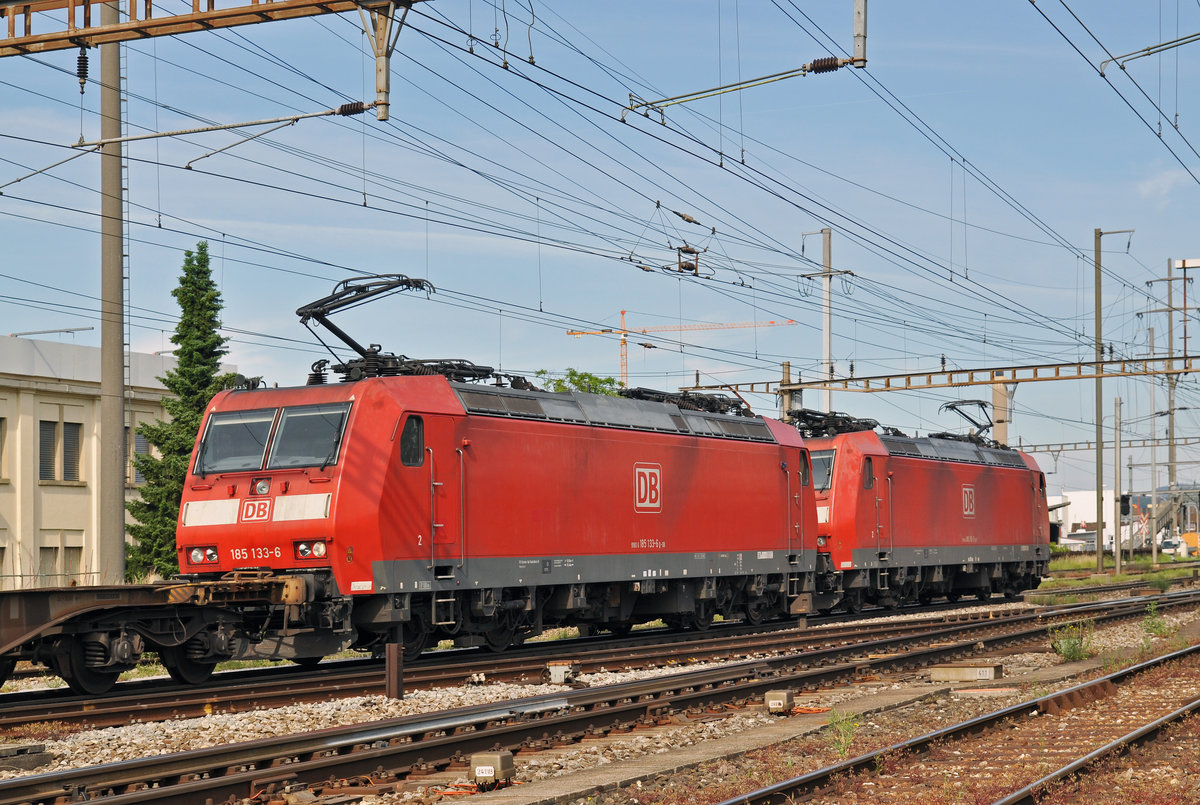 Doppeltraktion, mit den DB Loks 185 115-3 und 185 133-6, durchfahren den Bahnhof Pratteln. Die Aufnahme stammt vom 10.06.2016.