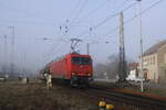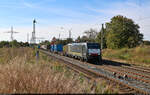 Mit Containern unterschiedlicher Bauart im Schlepp rollt 189 280-1 (Siemens ES64F4-280) bei Großkorbetha Richtung Leipzig.
