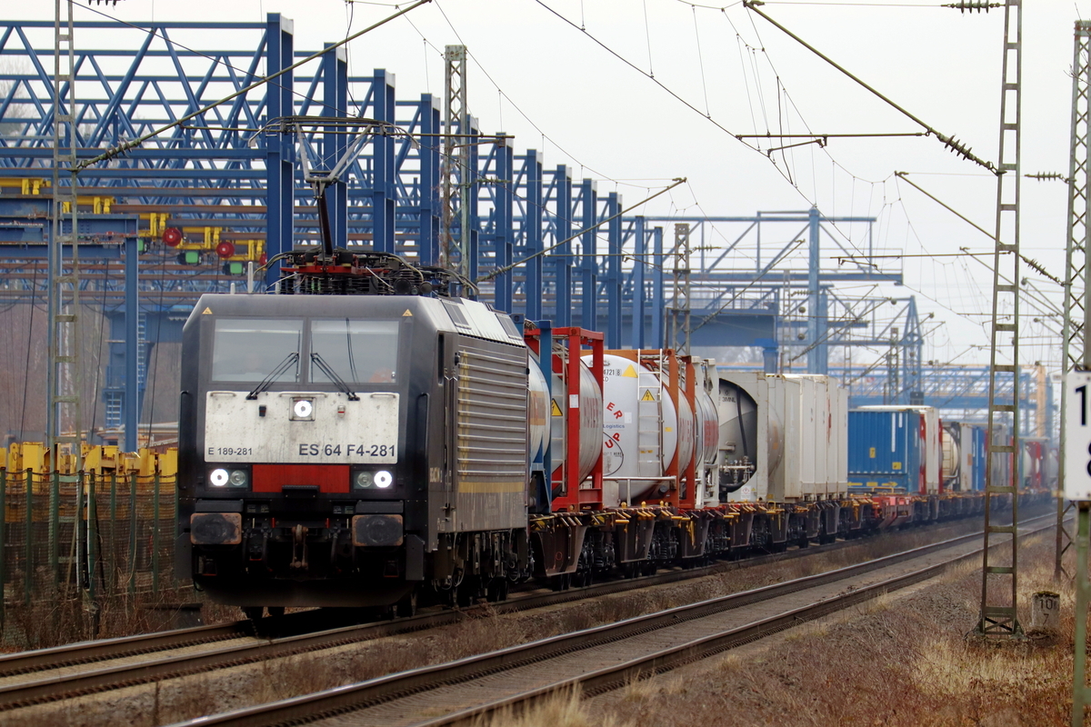 Eine schwarze Schönheit (189 284-3) fährt mit einem Kesselwagenzug durch Leipzig-Thekla. Fotografiert am 06.03.2010.
