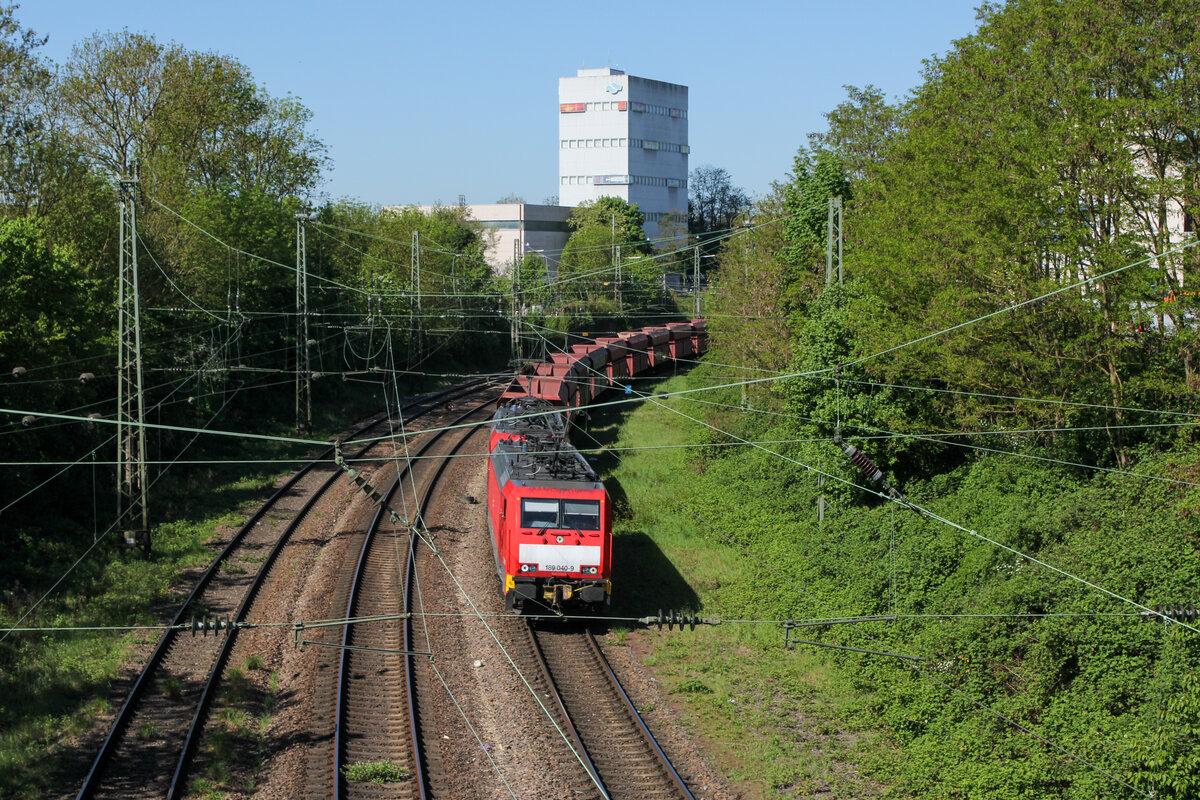 189 085 fährt mit einem gemischten Güterzug durch Grevenbroich in Richtung Mönchengladbach. Grevenbroich 23.04.2026