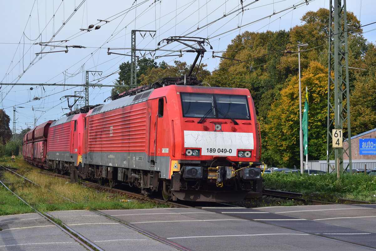 189 025-0 fährt mit einem gemischten Güterzug aus Richtung Grevenbroich durch Rommerskirchen in Richtung Köln.