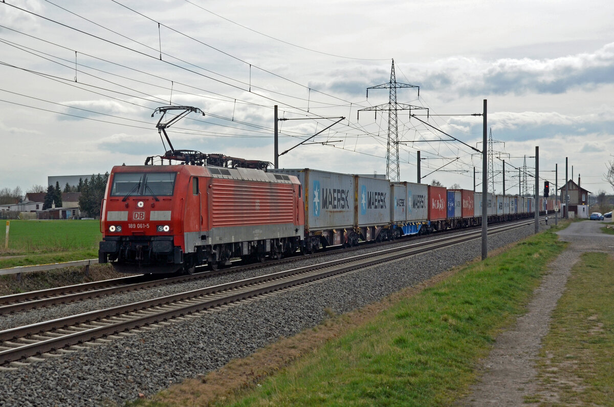 189 061 schleppte am 06.04.22 einen Containerzug durch Braschwitz Richtung Magdeburg. An zweiter Stelle läuft ein blau lackierter CD-Cargo-Tragwagen mit.