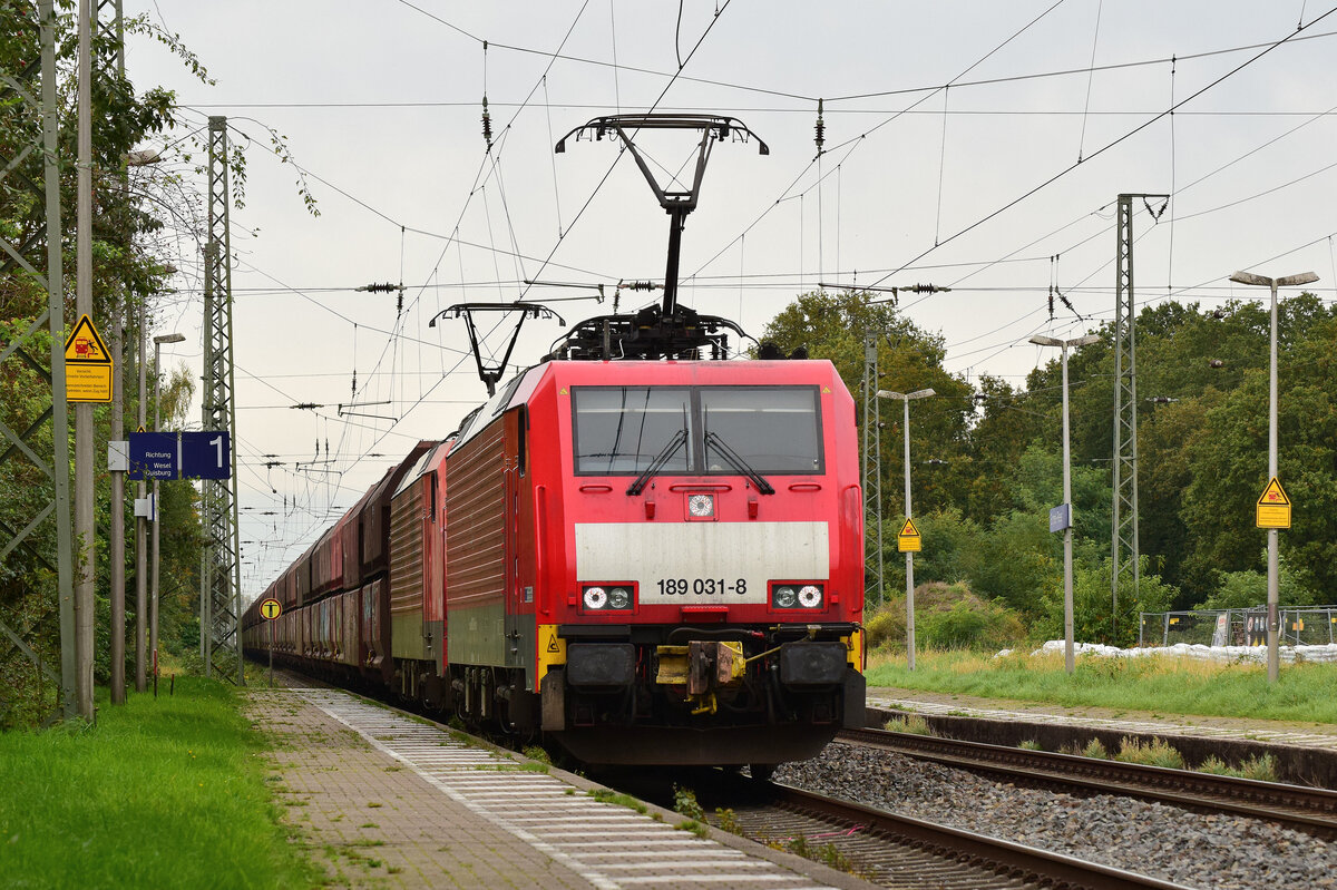 189 025-0 fährt mit einem gemischten Güterzug aus Richtung Grevenbroich durch Rommerskirchen in Richtung Köln.