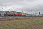 Mit einer leichten Verspätung rollen 218 411-7 und 218 446-3 mit dem IC 2012 am Haken bei Reichenbach Richtung Stuttgart, wo eine Lokomotive der Baureihe 101 den Zug übernehmen wird. (26.02.2026)