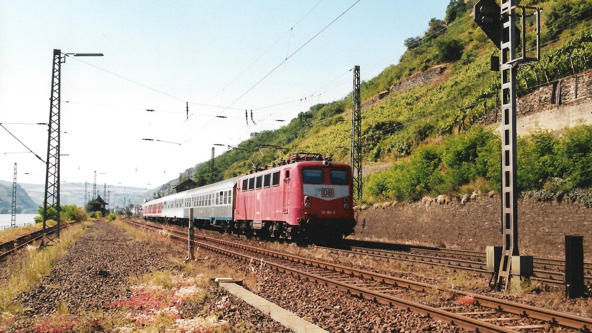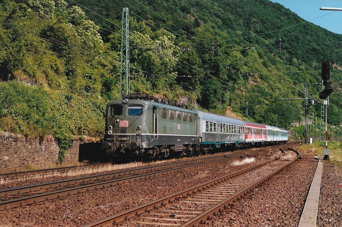 Rückfahrt nach Wiesbaden mit Steuerwagen voraus. Es schiebt 141 200 (Mai 1989). Der Steuerwagen "beherbergte" auch die erste Klasse der kurzen Garnitur.
