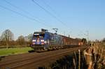 Macquarie European Rail 146 519, an HSL Logistik vermietet, schleppt Schüttgutwagen am 28.03.17 zwischen Bohmte und Ostercappeln in Richtung Osnabrück.