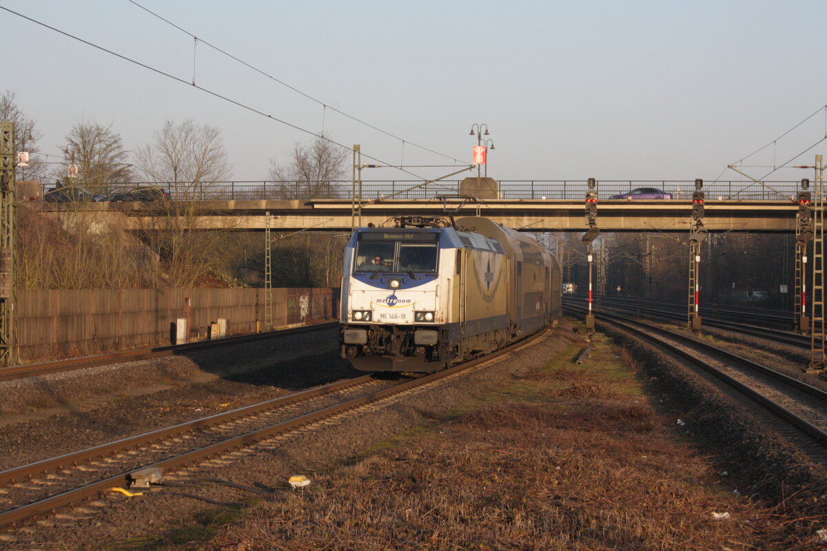 Metronom 146-10 (91 80 6146 510-3 D-AMS) mit dem RE 82020 von Bremen Hbf nach Hamburg Hbf, am 17.02.2026 in Hamburg-Veddel.