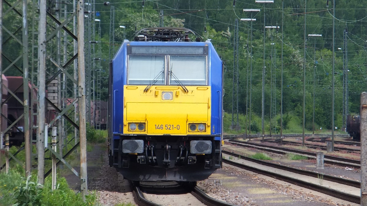 Eine abgestellte 146 521-0 mit einem Kesselwagenzug am Saarbrücker Güterbahnhof(31.05.2015)