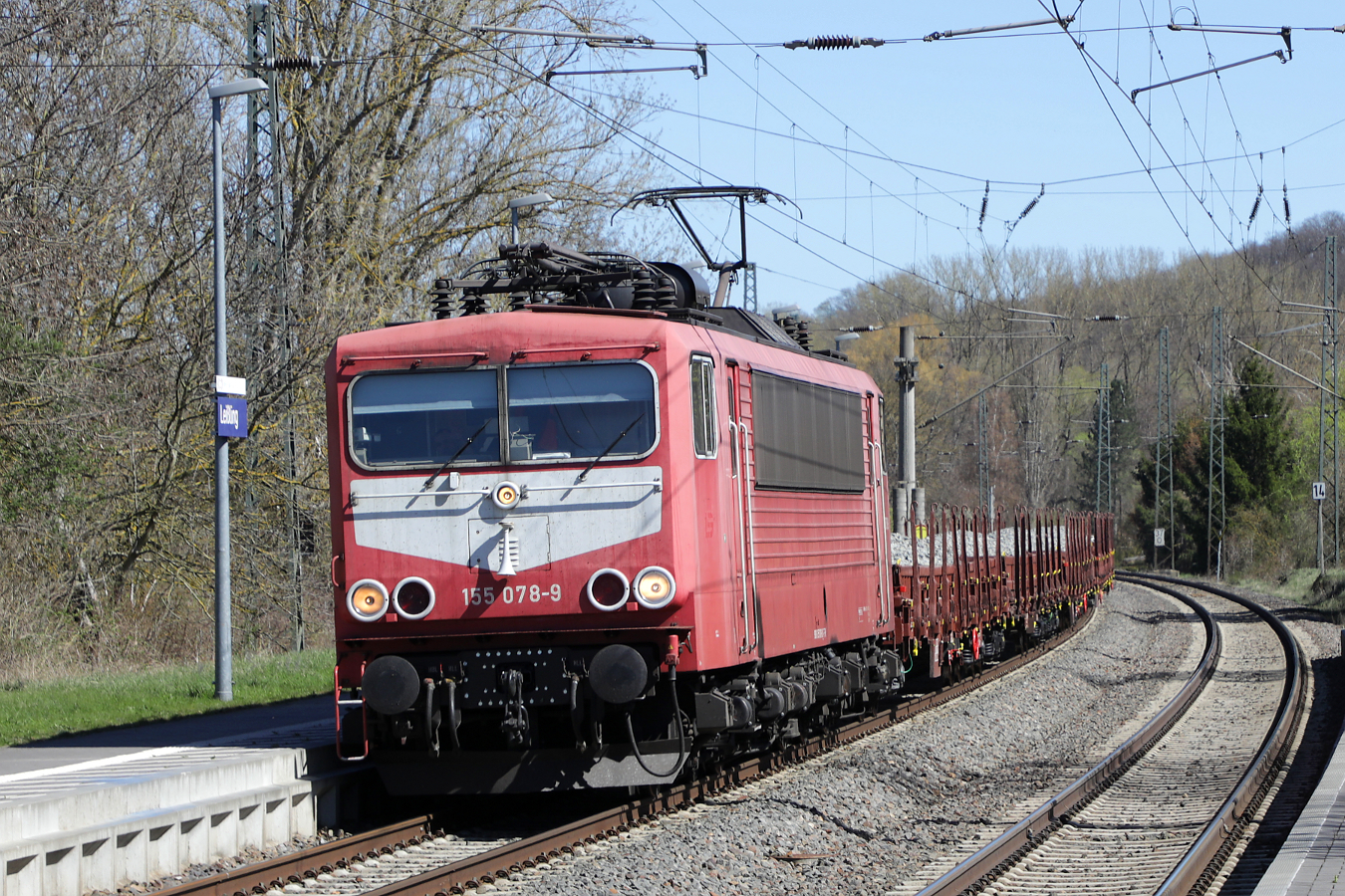 155 159 mit einem Holzzug am 16.05.2020 bei Gundelsheim.