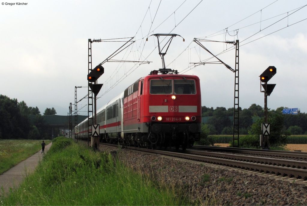 Die 181 204-9 mit dem IC 361 (Strasbourg-München) kurz vor dem Abzweig Brunnenstück bei Ettlingen. Aufgenommen am 21.07.2012.
