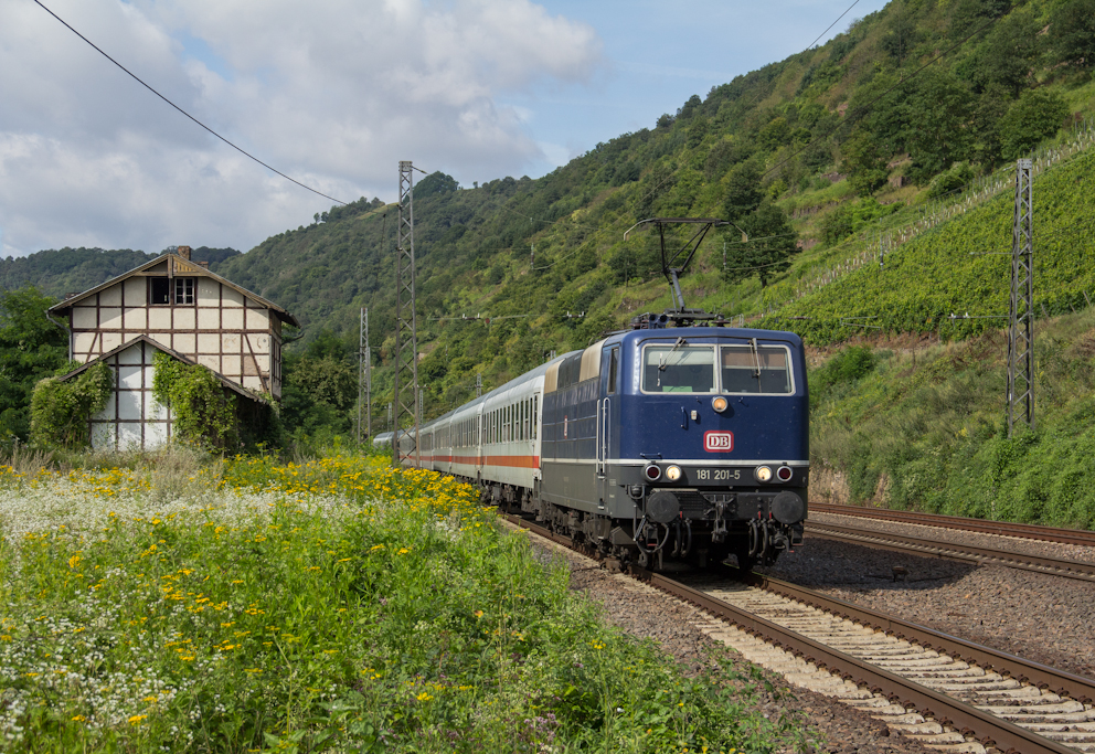 181-201 mit dem IC 133 (Luxembourg-Norddeich Mole) im Moseltal im alten Bahnhof von Hatzenport.(2.8.2012)
