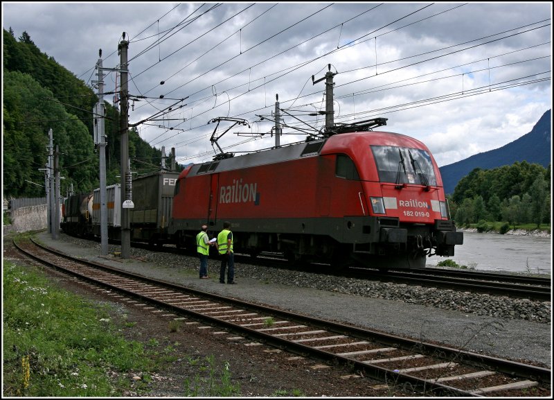182 019 (noch ohne UIC Nummer) wird gleich den Bahnhof Kufstein ohne Halt mit ca. 60 Km/h Richtung Wörgel durchfahren. Dort wird dem Zug warscheinlich eine Vorspann- und eine Schiebelok beigegeben. (04.07.07)