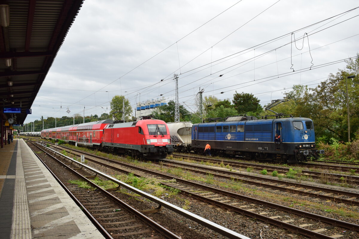 182 018 fährt mit ihrem Flughafen Express nach Berlin Hbf durch Berlin Greifswalder Straße während 151 139 mit ihren Zug darauf wartet abgefertigt zu werden.
