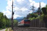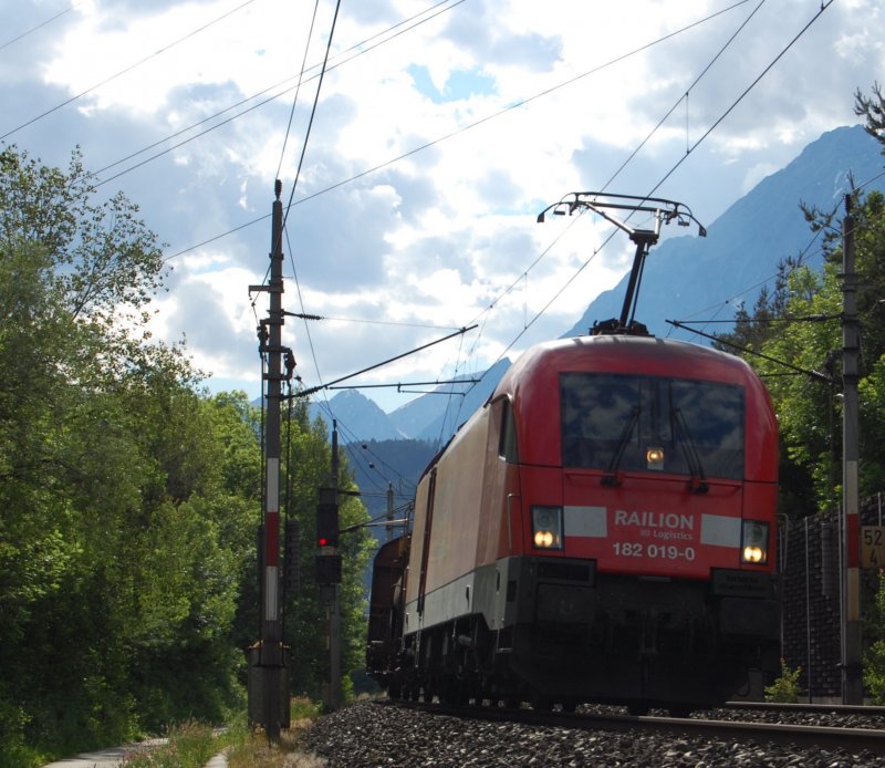 182 019 rast mit einem sehr kurzen Güterzug durch Vomp, 30.5.2009