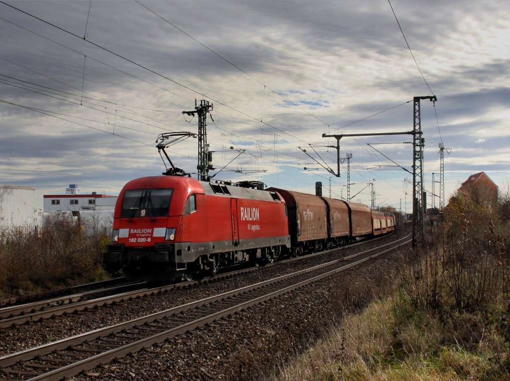 Die 182 020 am 13.11.2010 mit einem Güterzug unterwegs bei Obertraubling.