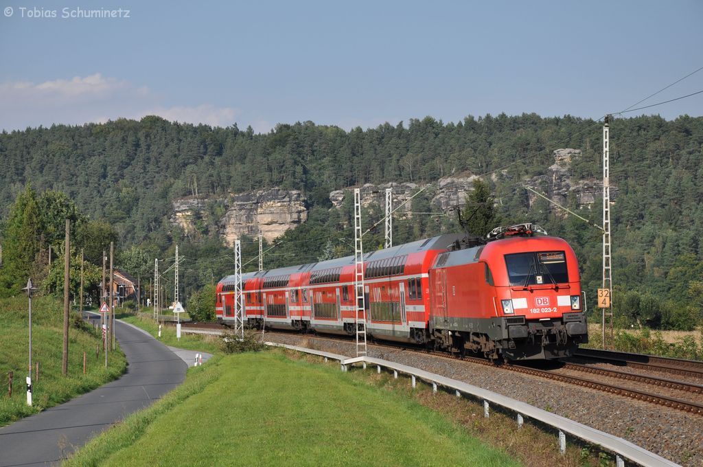 182 023 + Dosto als S1 (37745) von Meißen Triebischtal nach Schöna am 18.09.2012 bei Strand