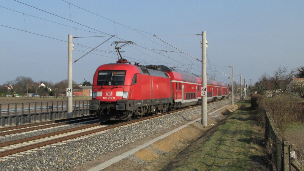 182 010-9 hatte am 22.03.2012 die Aufgabe den RE2 nach Cottbus zu schieben. Hier wird der Zug gleich den Bahnhof Lübbenau/Spreewald erreichen.