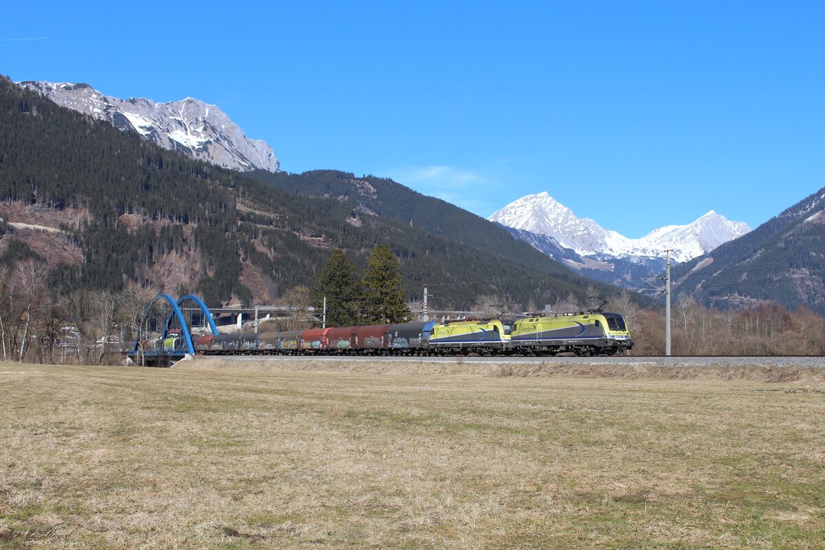 Kurz vor dem Bahnhof Admont fahren am winterlichen 18.2.2026 die CargoServ 182 581 und die 193 826 mit einem Stahlganzzug von Tarvisio Boscoverde nach Linz Stahlwerke ihrem Ziel entgegen.