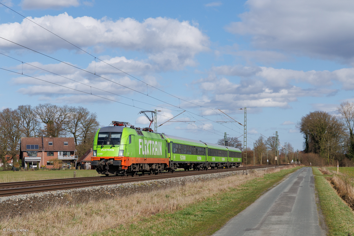 Taurus Boxxpress ES64U2-025 mit dem morgendlichen HKX 1800 nach Köln bei der Durchfahrt in Hasbergen. Der Zug bestand an diesem Tag durchgängig aus ehemaligen belgischen Schnellzugwagen.