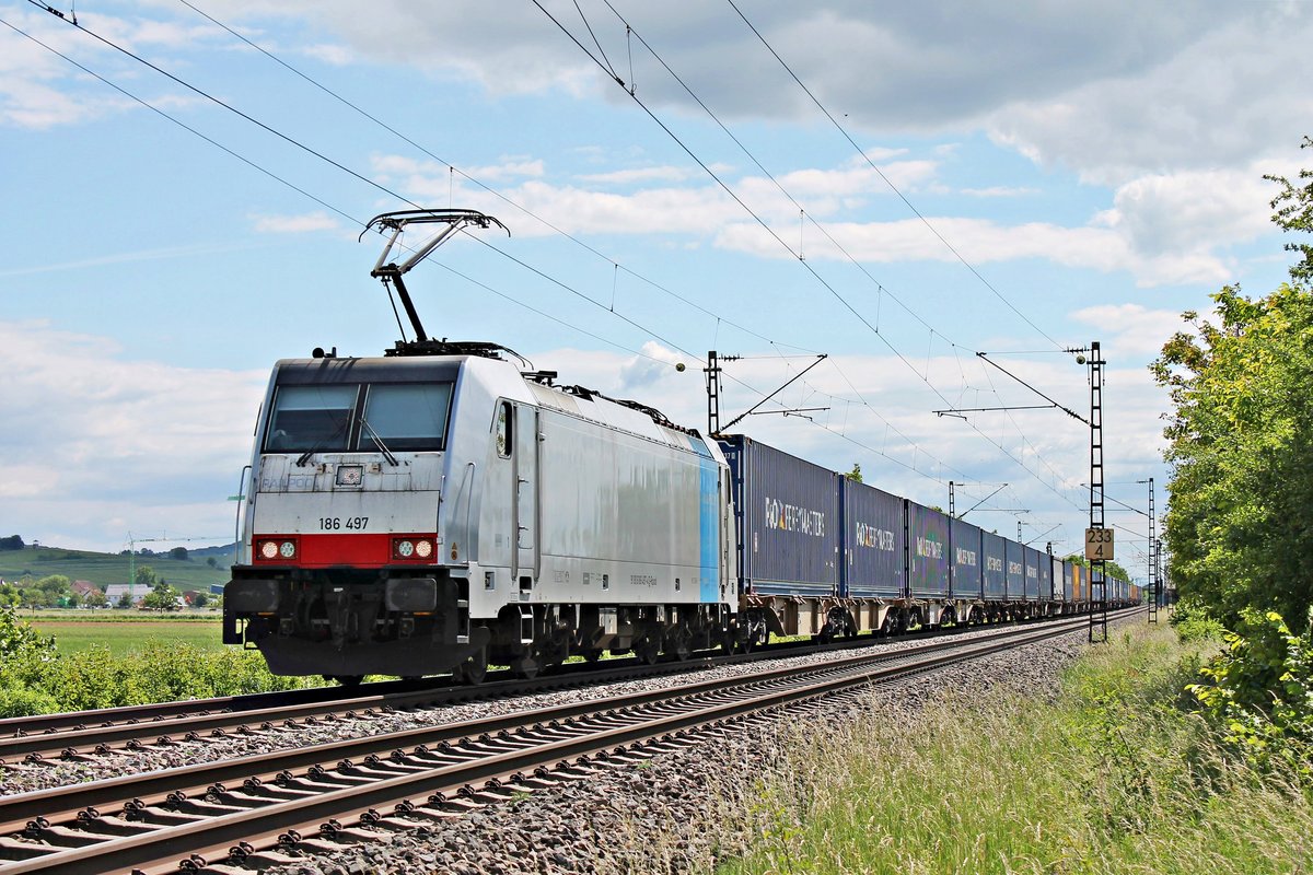 Mit dem DGS 40040 (Milano Smistamento - Zeebrugge Vorming) fuhr am Nachmittag des 25.05.2020 die Rpool/LINEAS 186 497 nördlich vonj Hügelheim über die Rheintalbahn durchs Markgräflerland in Richtung Freiburg (Breisgau).