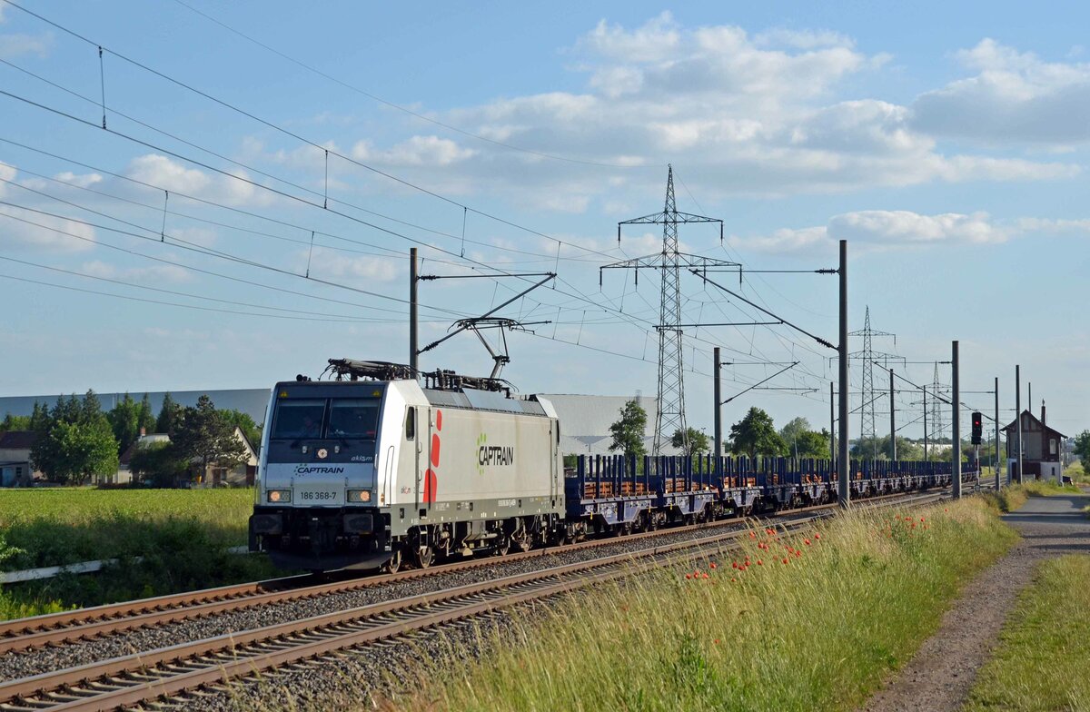 186 368 der akiem schleppte am 13.06.21 einen Captrain-Stahlzug durch Braschwitz Richtung Magdeburg.