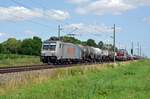 Kesselzug mit 186 276-2 unterwegs bei immer dunkleren Wolken an der Blockstelle (Bk) Braschwitz Richtung Halle (Saale).
