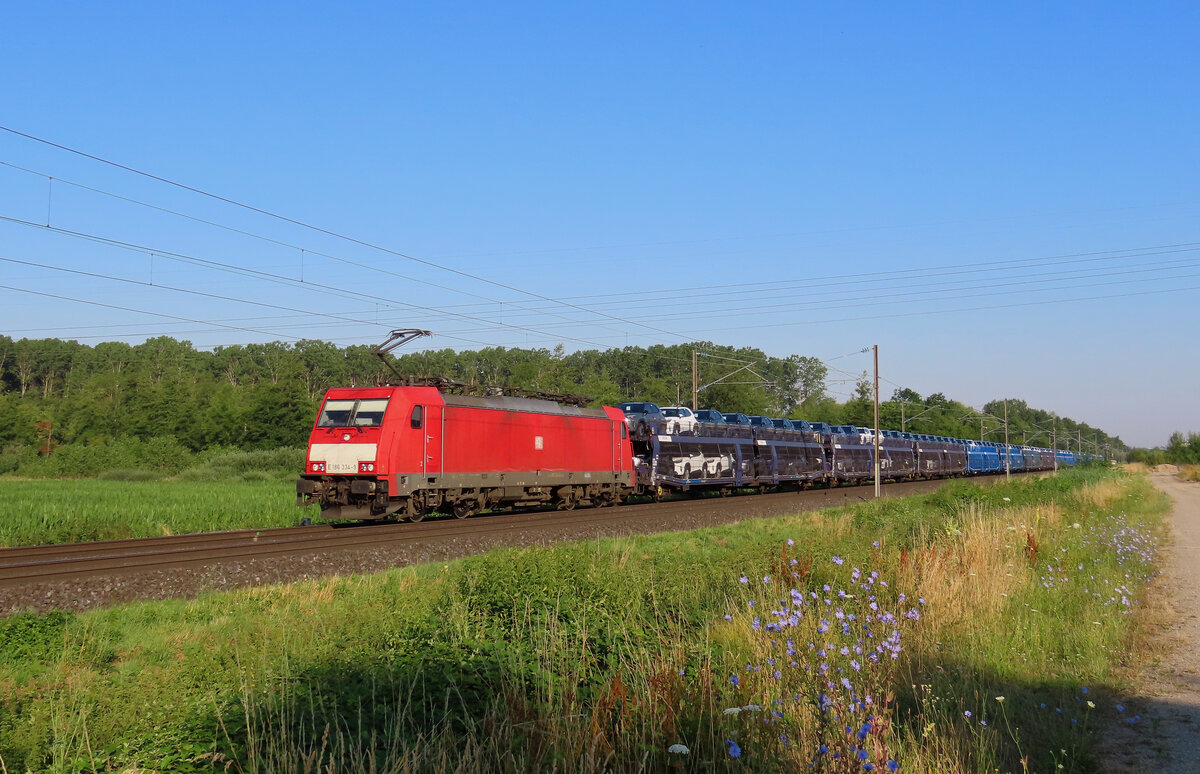 ECR 186 341-4 zieht ihre rote Schwester und einen gemischten Güterzug über die Kölner Südbrücke in Richtung Bonntor.