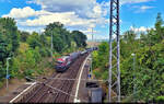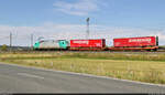 Einmal nicht aufgepasst, fährt ein Umleiter-KLV-Zug der polnischen Erontrans Sp.z.o.o. mit 186 127-7 Richtung Eichenberg. Als sich die Schranken im Kehmstedter Weg in Wipperdorf schlossen, eilte ich in Ermangelung von Motiven zurück zur Straße der Einheit, wodurch dieser Seitenschuss entstand.