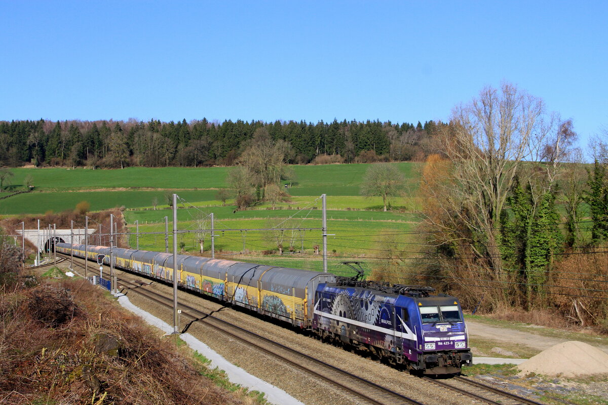 An einem bewölkten Septembertag durchfährt die 186 540-1 der Railpool mit einem Zug, welcher aus Kesselwagen besteht, Eichstätt Bahnhof Richtung Treuchtlingen. Die Lokomotive ist mit den Logos von VTG und Retrack versehen. Der Zug könnte der Kreidezug sein, welcher seine Fracht aus der Slowakei kommend nach Norddeutschland transportiert.