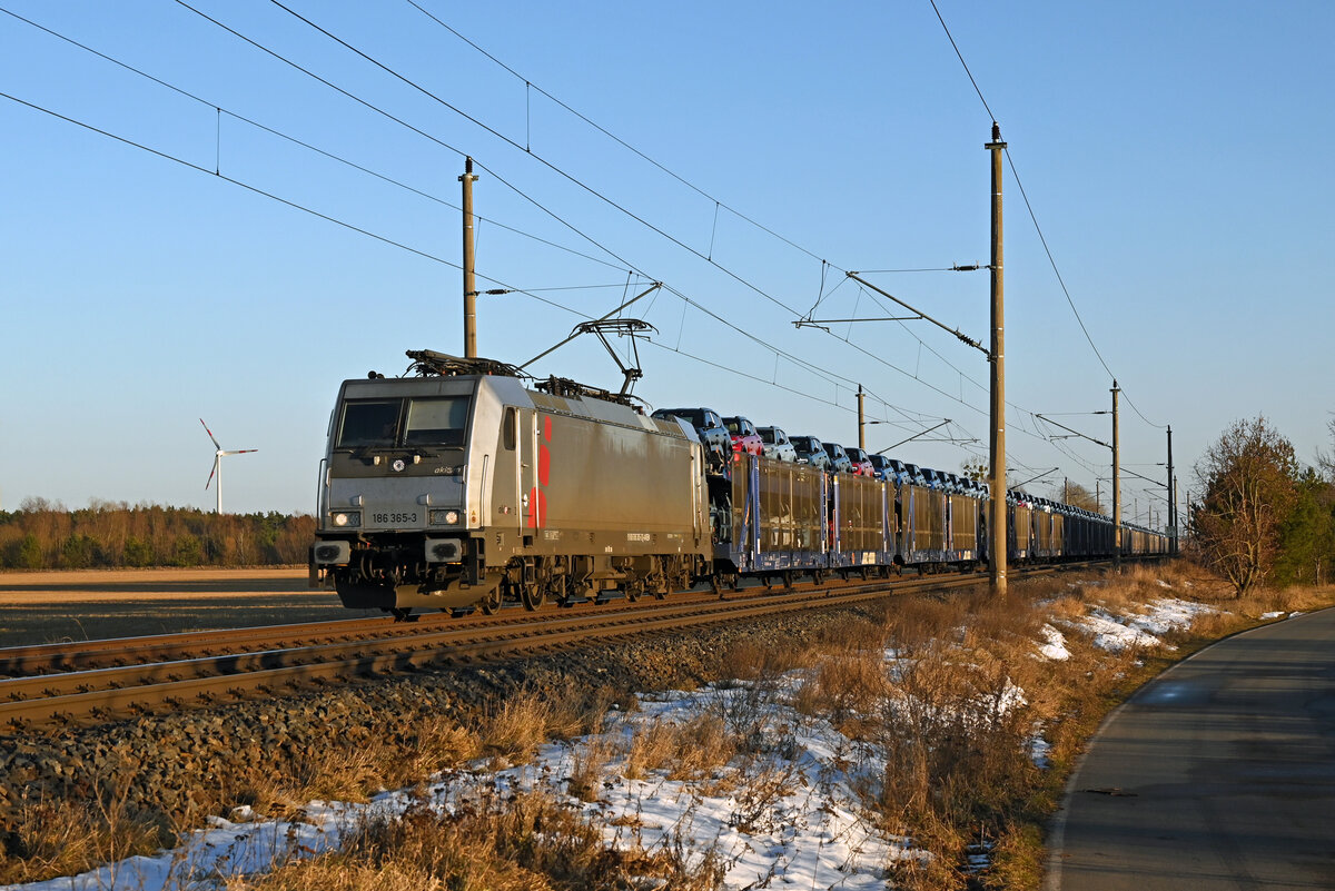 186 365 der akiem führte am 18.01.26 einen Autozug vom Typ Citroen durch Wittenberg-Labetz Richtung Dessau.