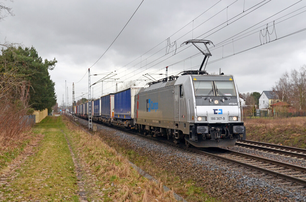 186 367 der akiem führte für CD Cargo am 20.02.24 einen KLV-Zug durch Wittenberg-Labetz Richtung Falkenberg(E).
