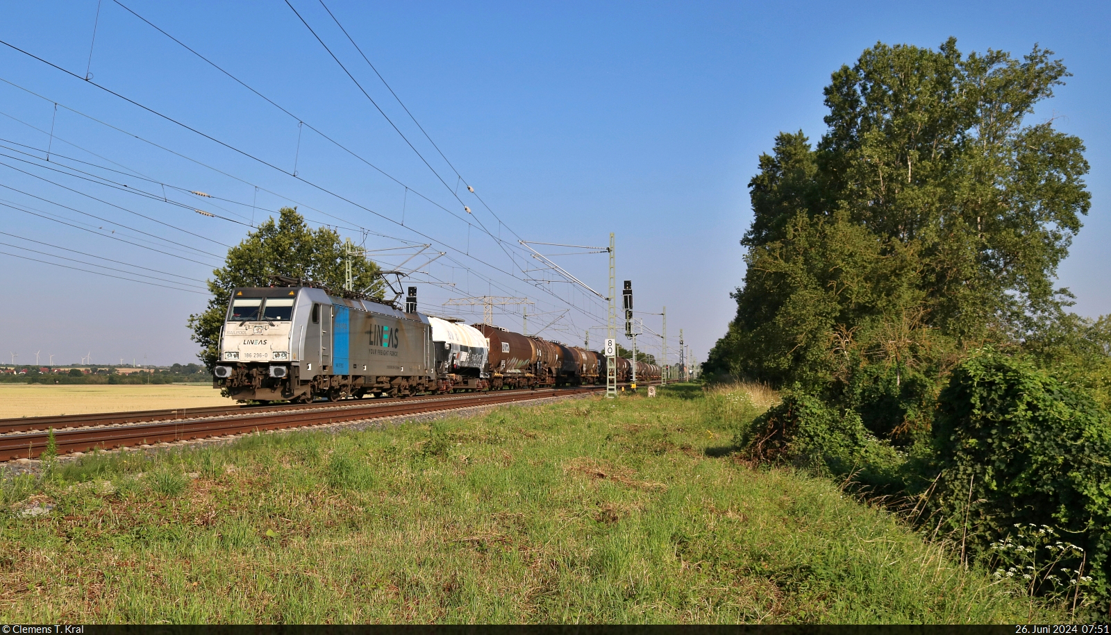 186 296-0 wurde von den Buna-Werken mit Kesselwagen herausgeschickt und in der Saaleaue Richtung Halle Rosengarten fotografiert.