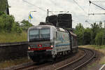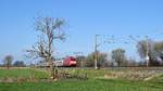 Railpool 186 508 (91 80 6186 508-8 D-Rpool), vermietet an Lineas, mit Volvo-Logistikzug DGS 46257 Hallsberg RB - Gent Zeehaven. Der Zug ist auf dem Gegengleis unterwegs, um von einem folgenden ICE auf dem Regelgleis überholt zu werden (Hüde, 02.04.2025).