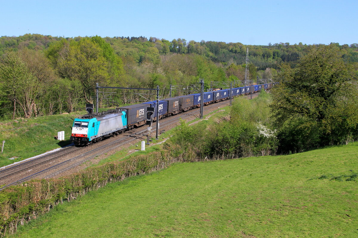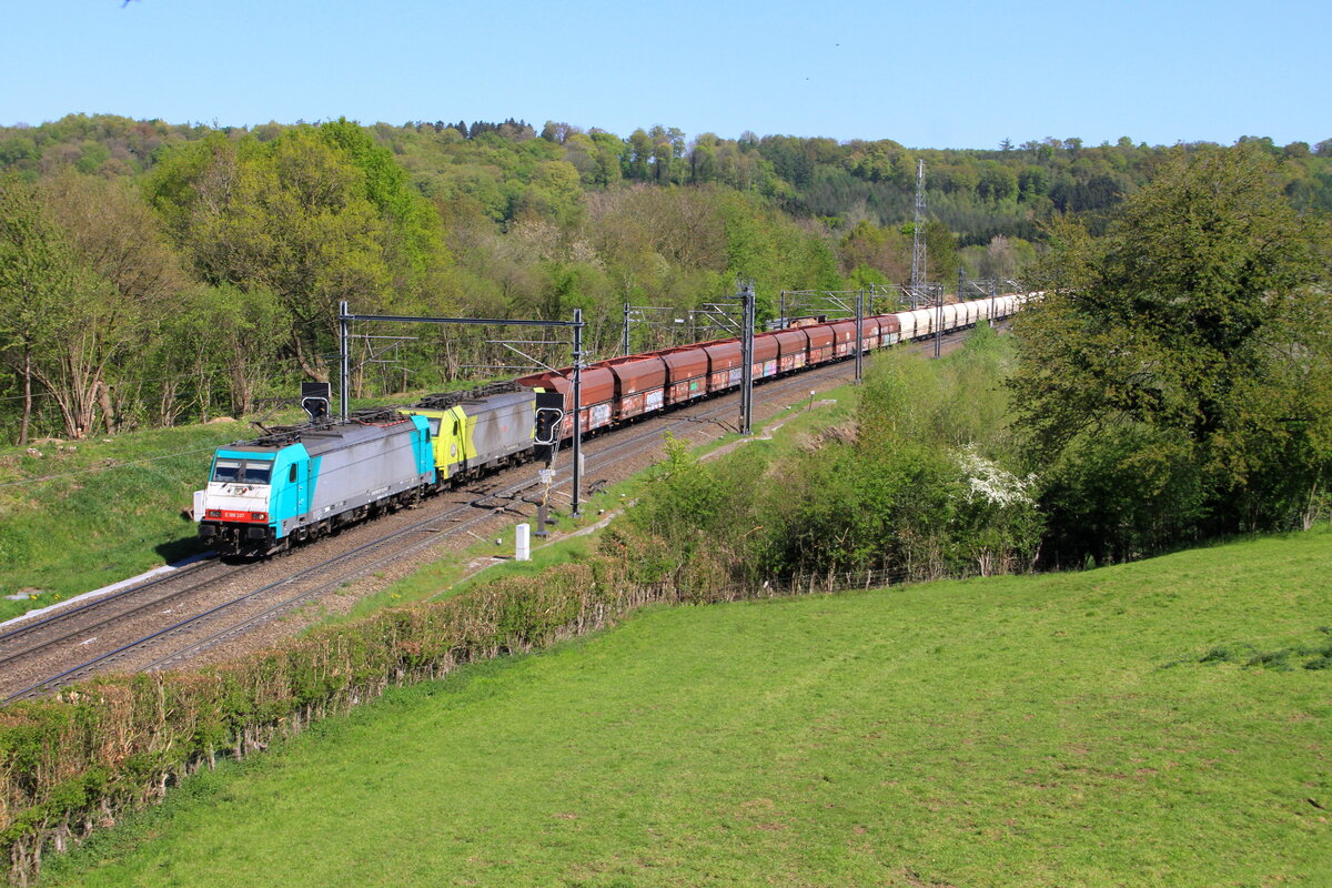Doppeltraktion, mit den Loks 186 107-9 und 486 504-4 durchfährt am 16.04.2026 den Bahnhof Pratteln.