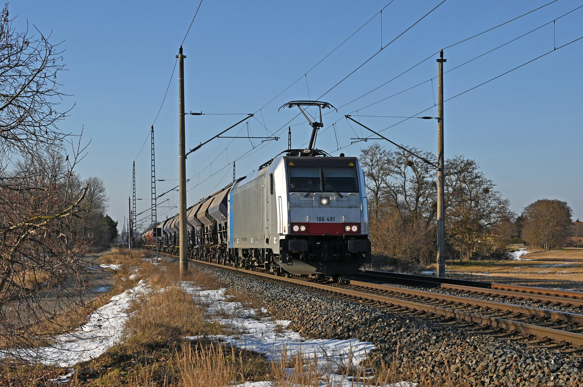 Ein Cobra-Doppel, angeführt von 186 209 (2817) rollt am 25.08.2011 mit einem langen Kohlenzug von Belgien kommend auf den letzten Metern der Montzenrampe nach Aachen West.