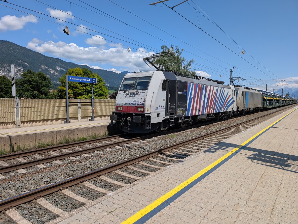 186 123 von Railtraxx steht in Aachen-West mit einem langen Containerzug aus Genk-Goederen(B) nach Frankfurt-Höchstadt/ am Main und wartet auf die Abfahrt nach Köln.