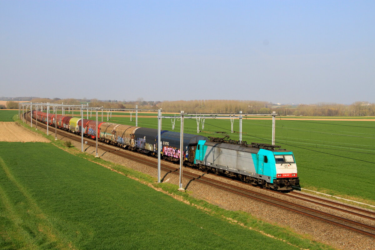 Durch Grevenbroich kommt die 186 105-3 mit einem Containerzug gen Rheydt fahrend.
