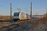 187 505 der akiem schleppte am 04.12.25 für Metrans einen Containerzug durch Braschwitz Richtung Halle(S). Ziel war das Containerterminal in Leipzig-Wahren.