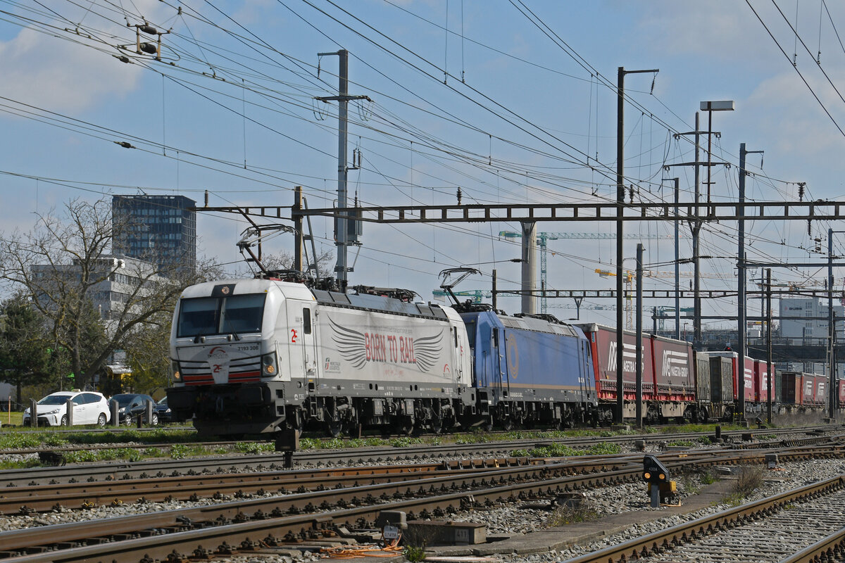 Hier schlägt das Kultur-Herz höher: 6193 746-5 "Hugo von Hofmannsthal" zieht 6193 218-5 "Ludwig van Beethoven" / "Ode an die Freude" (Siemens Vectron) sowie blaue Holzhackschnitzel-Container der TRANSWAGGON GmbH durch Großkorbetha Richtung Weißenfels. 🧰 ELL Austria GmbH (European Locomotive Leasing), vermietet an die Salzburger Eisenbahn Transportlogistik GmbH (SETG) 🕓 28.3.2025 | 17:27 Uhr