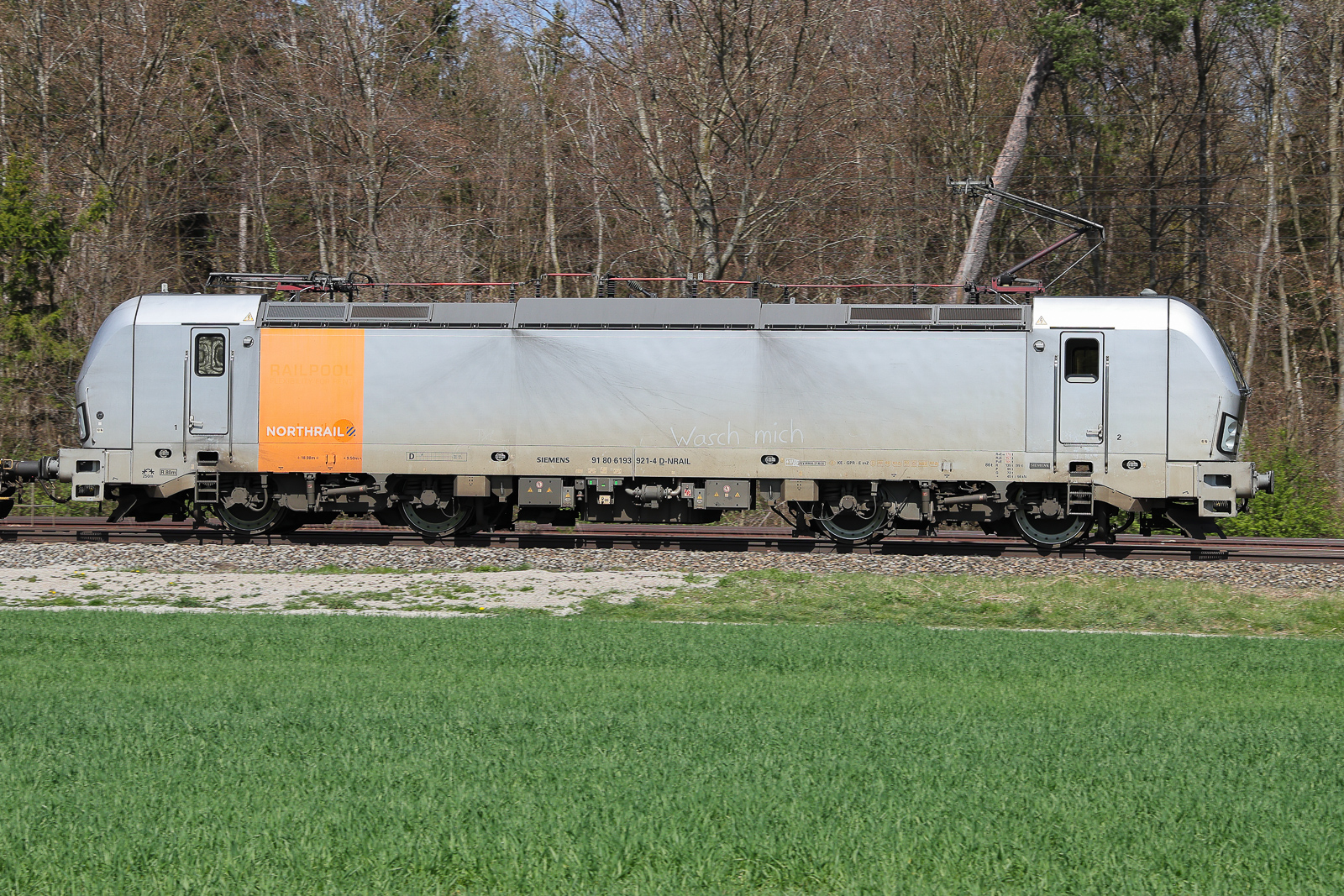 Northrail 193 921 am 11.4.26 bei Eglharting. Wasch mich ! Das hätten nach dem Winter so einige Loks nötig.