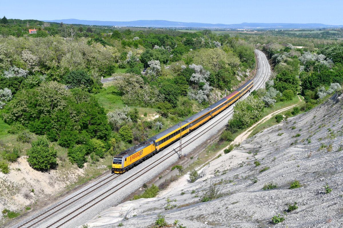 Vom Belvedere über Usti nad Labem hat man einen schönen Blick auf den Bahnhof Usti nad Labem h.l.n. mit dem dort abgestellten zweiteiligen RJ 654 006, Oktober 2025.