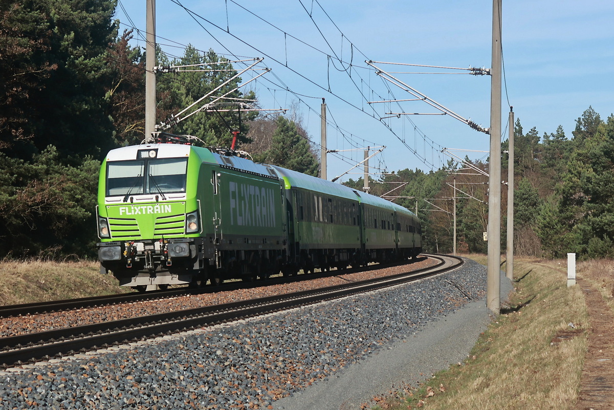 193 443-9 (ELL / Flixtrain) mit dem FLX 30 (FLX 1321) Richtung Berlin Ostbahnhof in Bönen Nordbögge, 7. März 2026