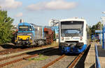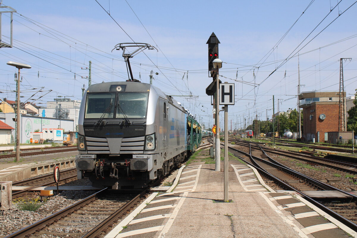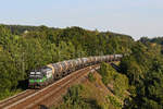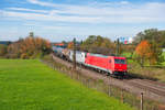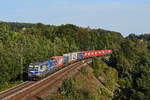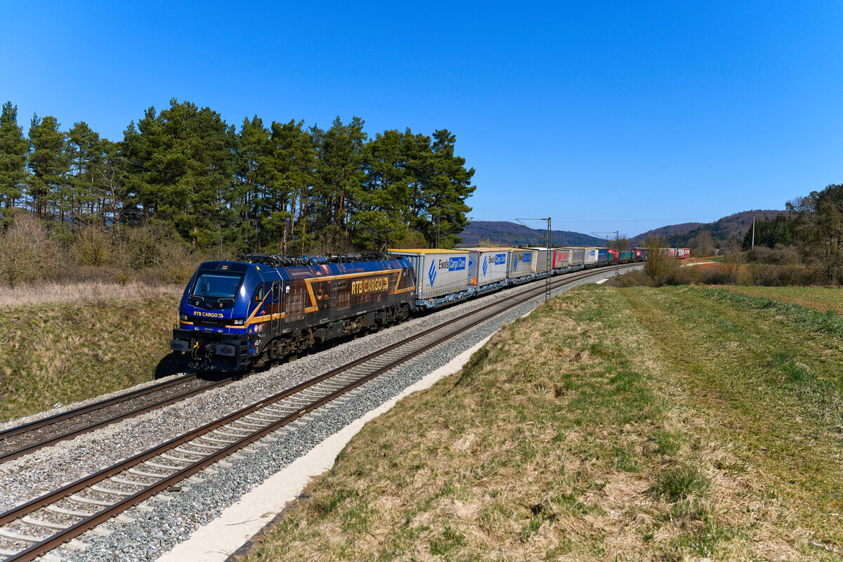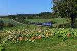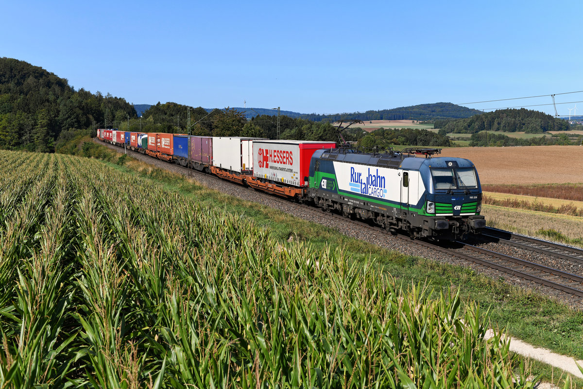Der DGS 40679 von Genk nach Curtici wurde am 19. September 2020 von dem für die Rurtalbahn fahrenden ELL Vectron 193 229 bespannt. In der frühherbstlichen Oberpfalz bei Darshofen konnte ich den bunten KLV-Zug aufnehmen. Im Hintergrund erkennt man den Fernmeldeturm Seubersdorf. Und wer genau hinsieht, kann den Kirchturm von Krappenhofen finden.