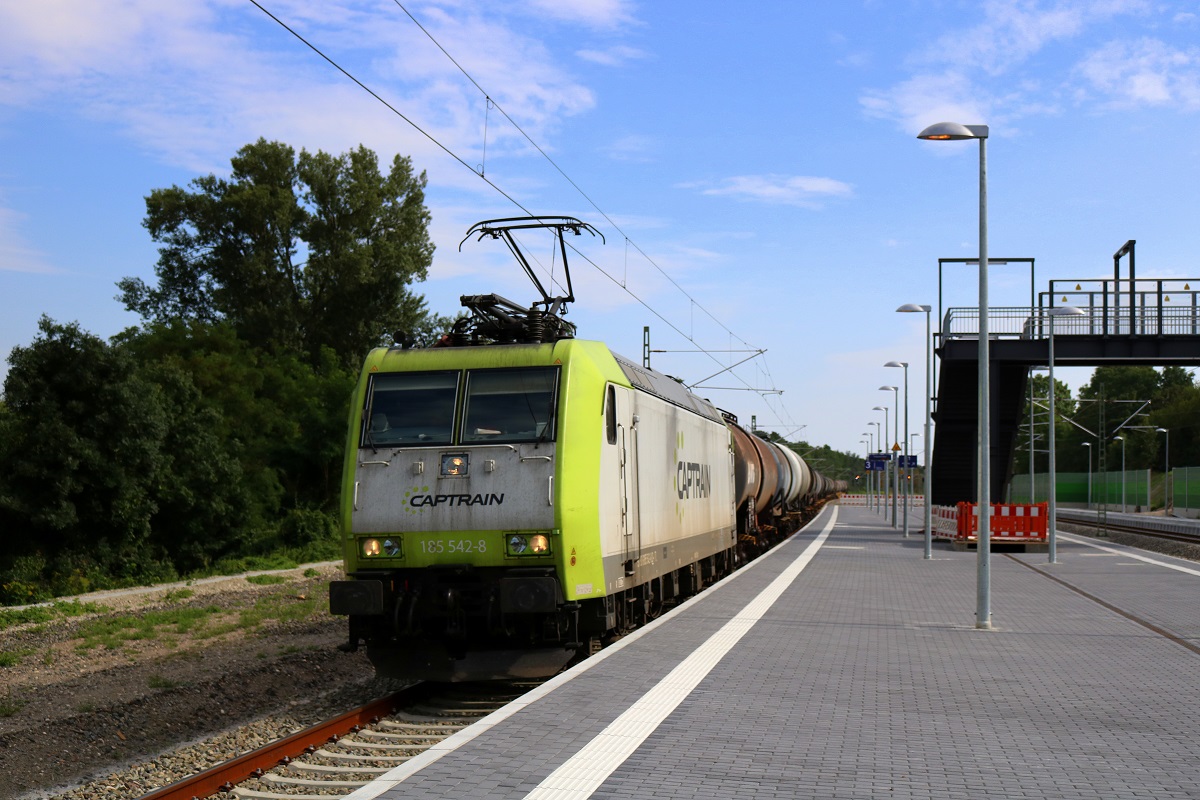 Schiebewandzug mit 193 558-4 "Natural Talent" (Siemens Vectron) durchfährt den Bahnhof Schkopau auf Gleis 1 Richtung Merseburg Hbf.