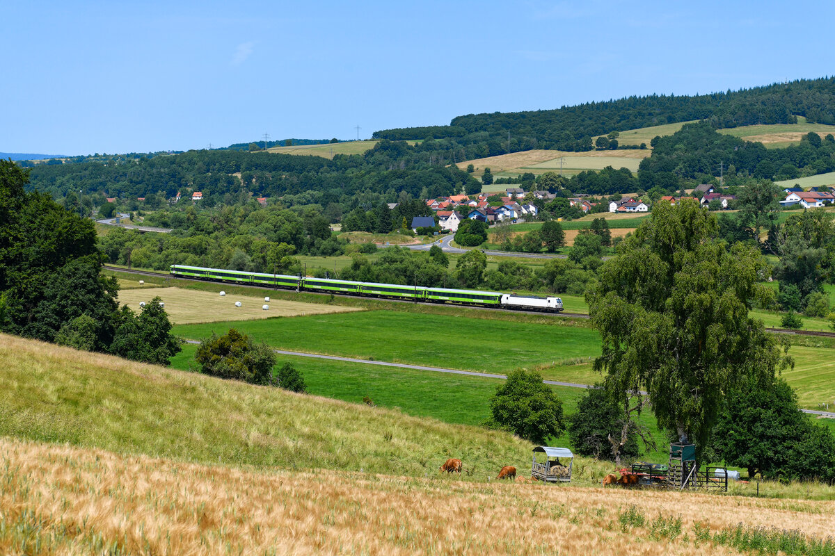 Der FLIXTRAIN 1243 war am 21. Juni 2025 auf seiner Fahrt nach Basel Badischer Bf von der noch im Auslieferungszustand befindlichen 193 447 von ELL bespannt. Serienmäßig werden die Vectrons nämlich in der Farbe weiß ausgeliefert. Eine Folierung auf die grüne corporate identity von FLIXTRAIN war zum Aufnahmezeitpunkt noch nicht erfolgt. Bei Hermannspiegel konnte ich den Zug bei seiner Fahrt durch die idyllische Landschaft der Vorderrhön aufnehmen.